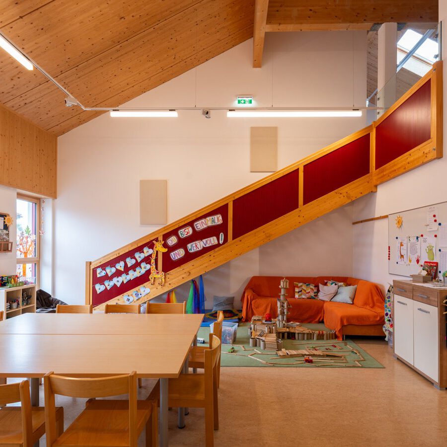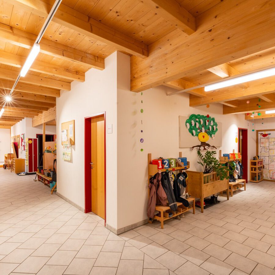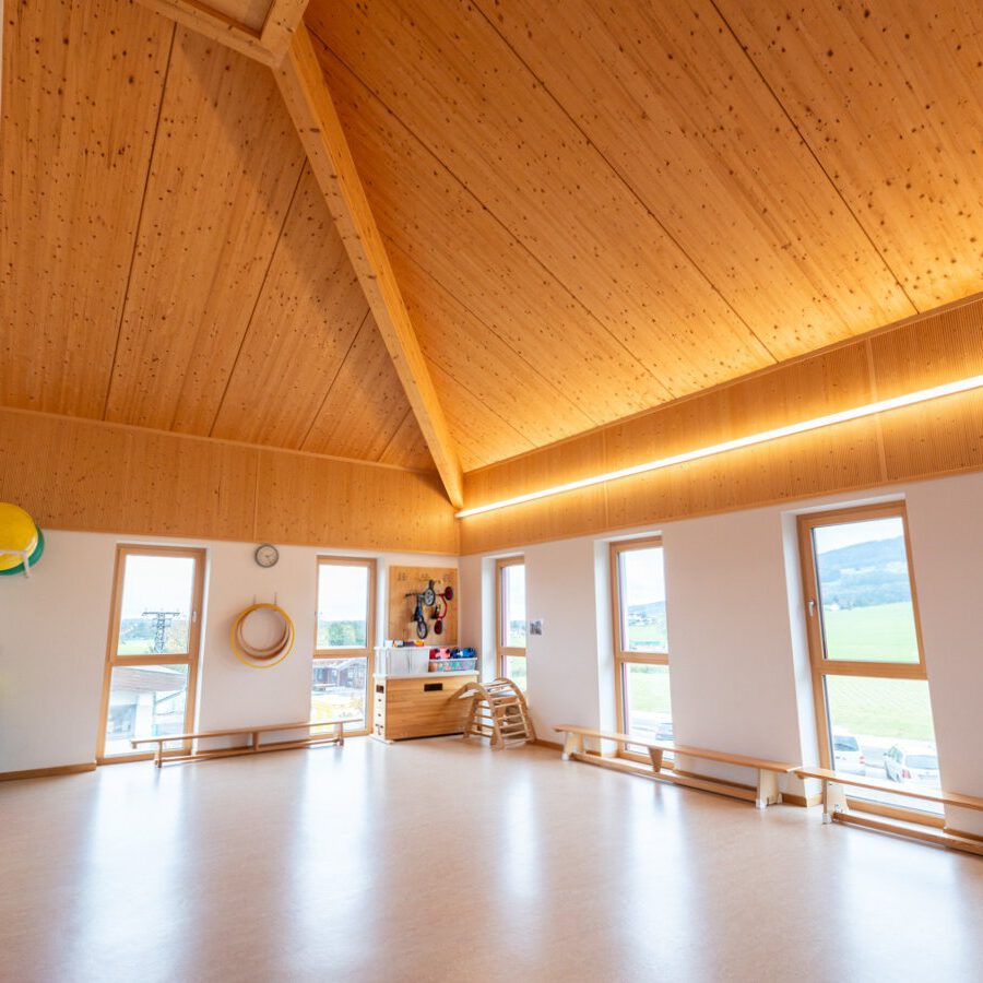 Kindergarten Anthering gut bedacht Baufertigstellung: 2017 Bauherrschaft: Gemeinde Anthering Unsere Leistungen: Sichtdachstuhl, Stiege, Tramdecke Planung: BM Ing. Hermann Aigner Fotos: © Eder Holzbau / Jakob Eder Project navigation